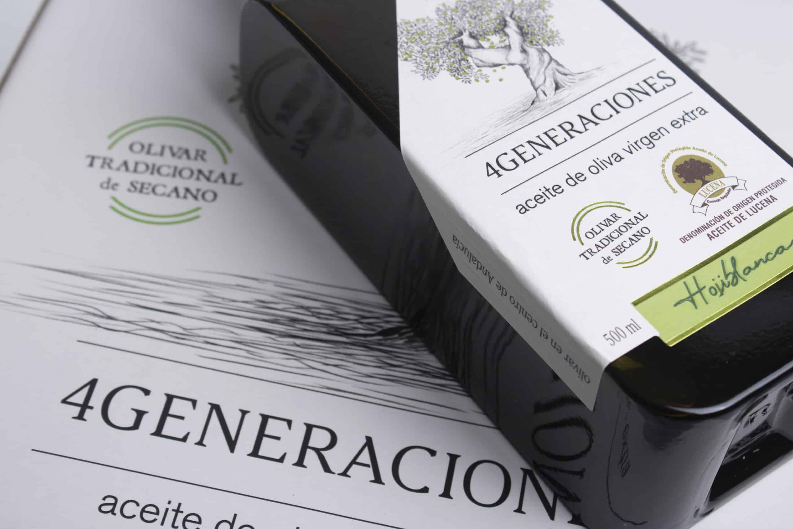 El diseño de la etiqueta y el packaging de Aceites 4 Generaciones busca comunicar las características diferenciales de este AOVE ecológico, destacando su origen en el centro de Andalucía, el olivar tradicional de secano y la variedad de aceituna hojiblanca.