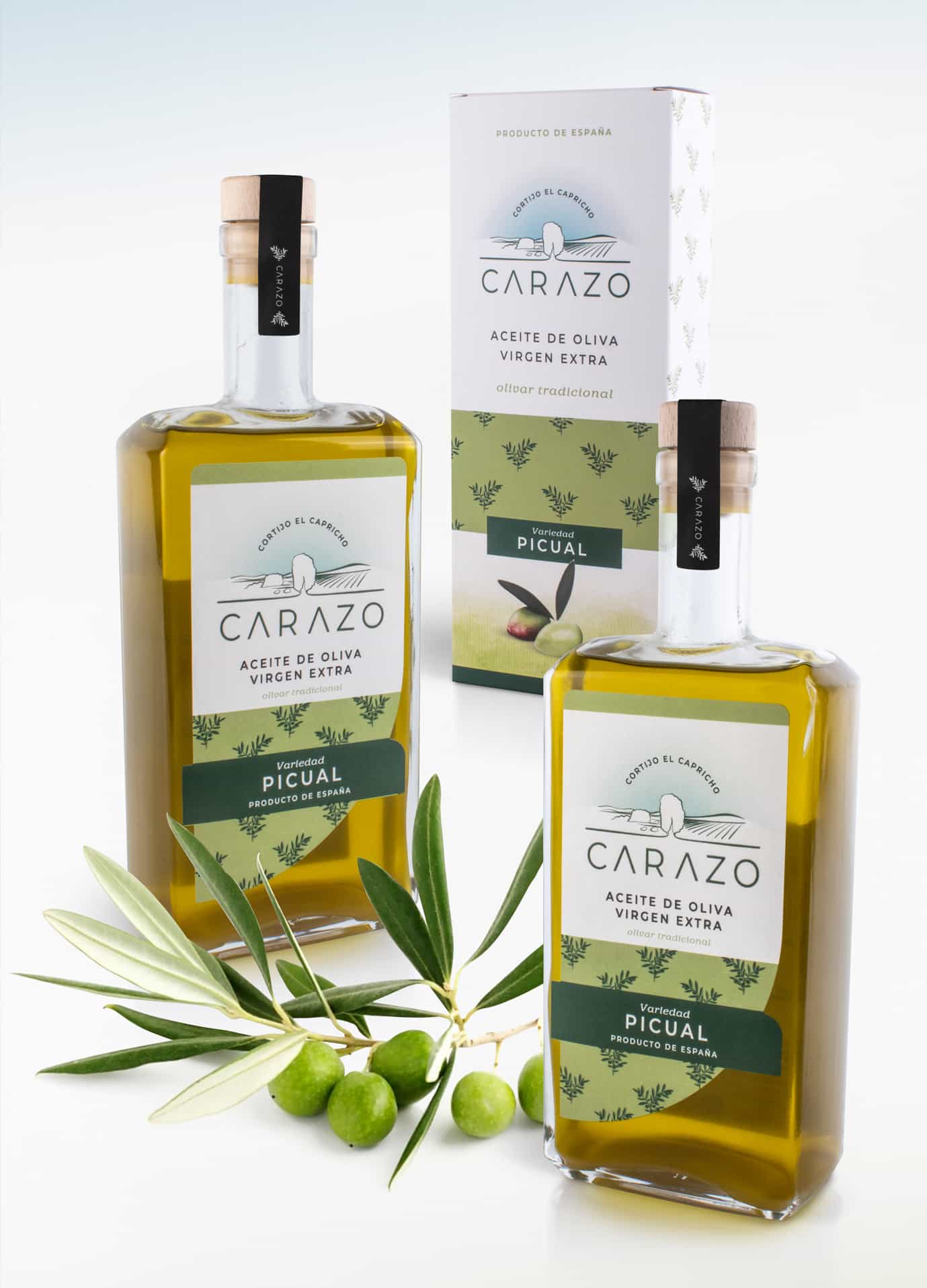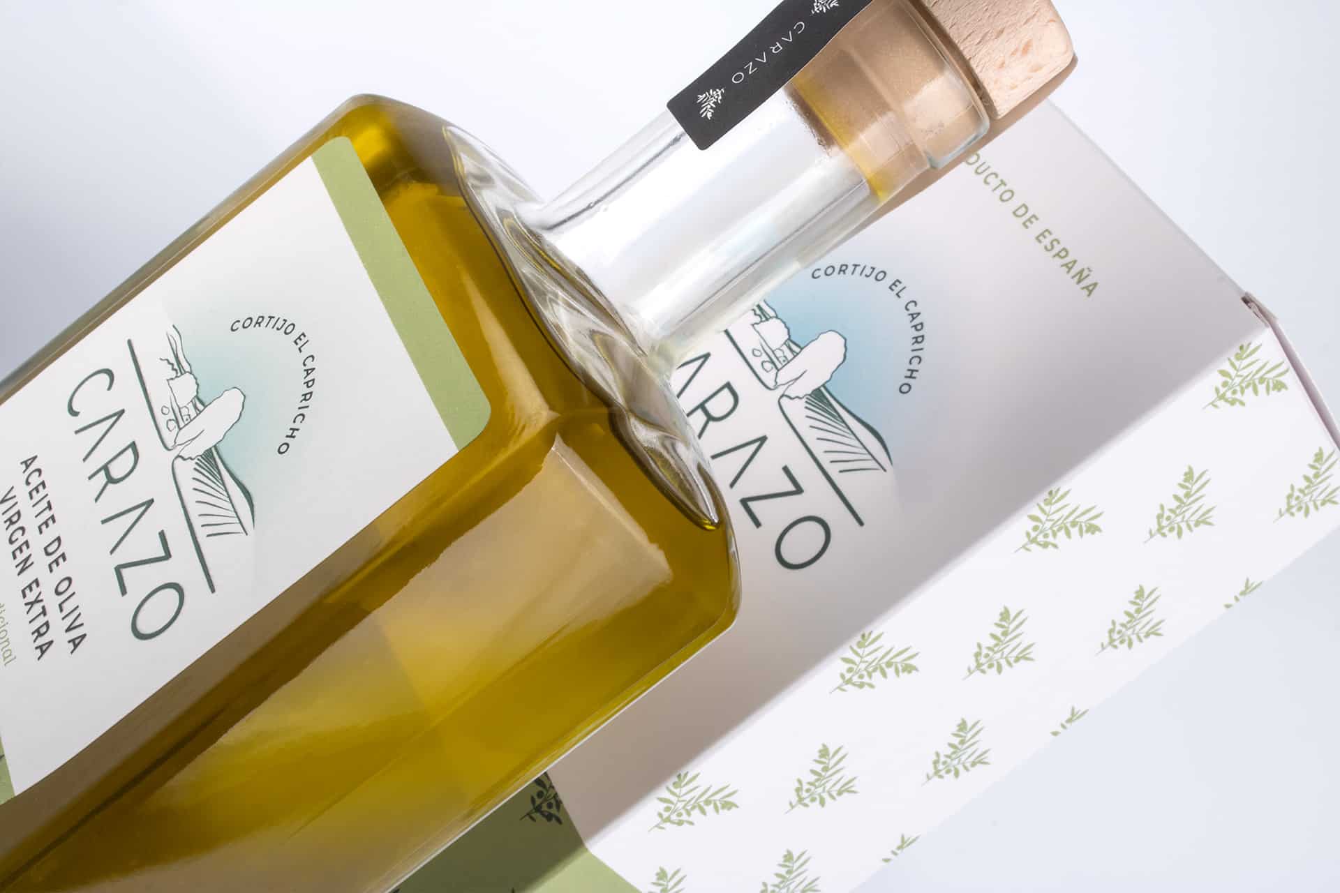 Los tonos verdes del diseño han buscado que contraste de forma elegante con el aceite, realzando así la presencia del producto. Precisamente por esta transparencia del vidrio, se hace imprescindible el desarrollo de una caja que proteja el aceite de la incidencia de la luz y ayude a preservar intactas sus cualidades organolépticas.