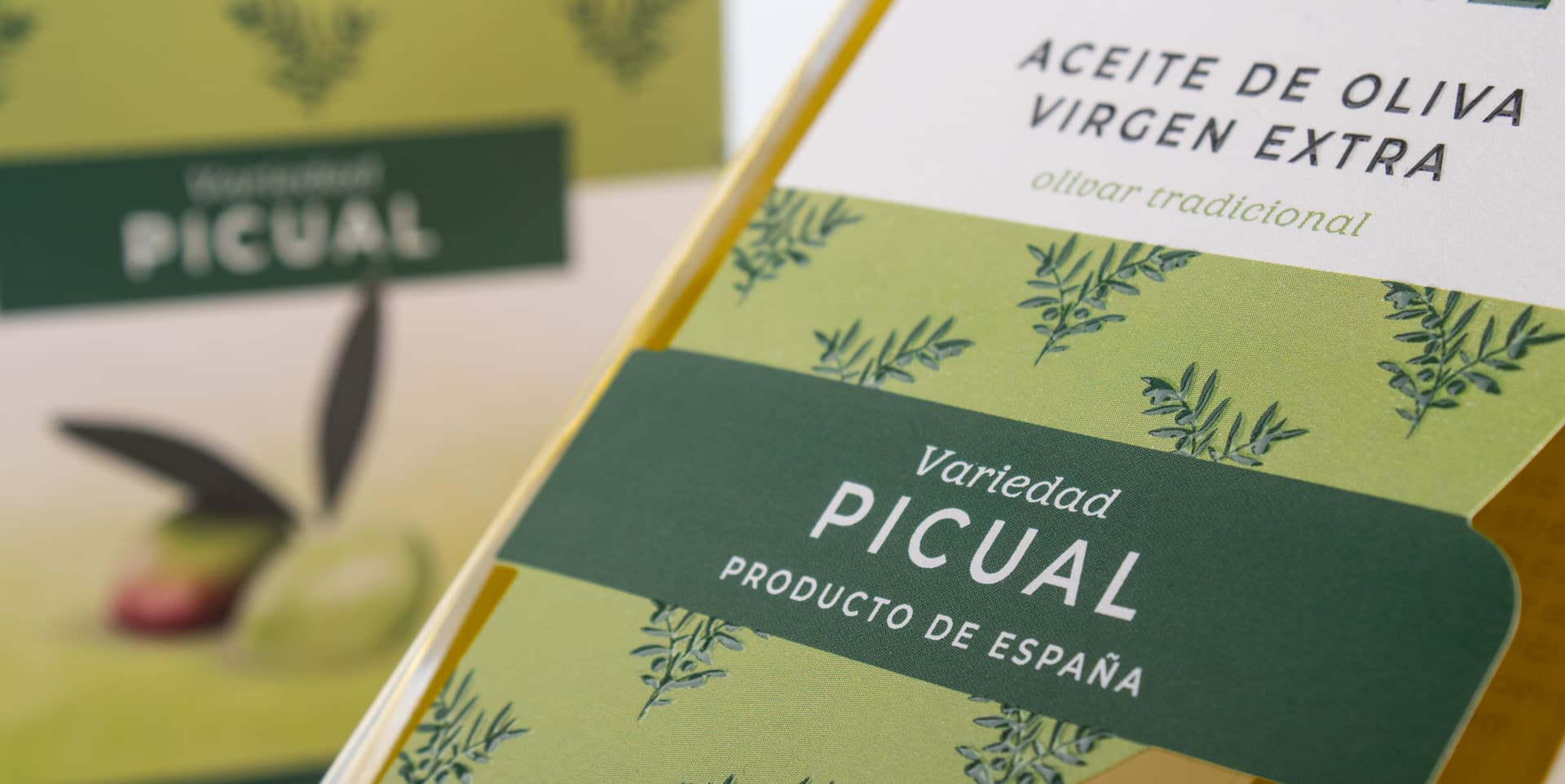 El diseño se apoya en una composición equilibrada, donde los espacios en blanco juegan un papel fundamental para realzar el logotipo y el símbolo. Como elemento gráfico distintivo, se ha desarrollado un motivo a partir de una rama de olivo, tratada de forma delicada y repetitiva, que recorre la etiqueta y la caja aportando ritmo visual y un carácter refinado, además de servir en un futuro como elemento gráfico para diferenciar la gama de diferentes variedades.